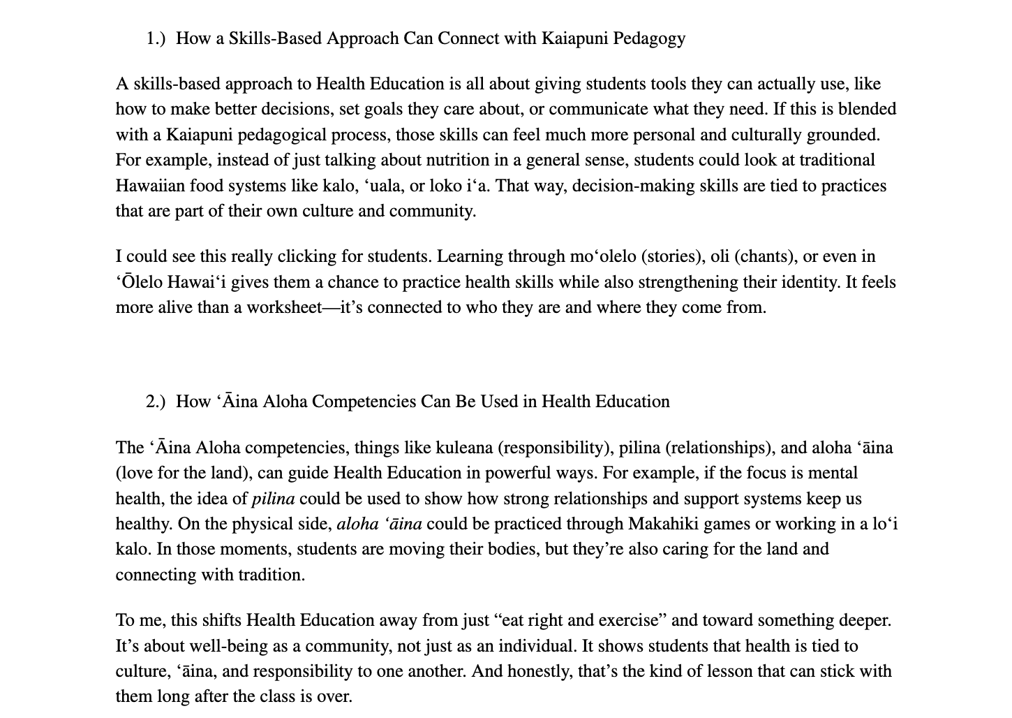 My teaching is rooted in Hawaiʻi’s values and community, emphasizing cultural responsiveness. I adapt activities, provide choices, and create entry points so students of all abilities can participate and succeed. This includes differentiation and multiple entry levels to ensure every student can engage.
